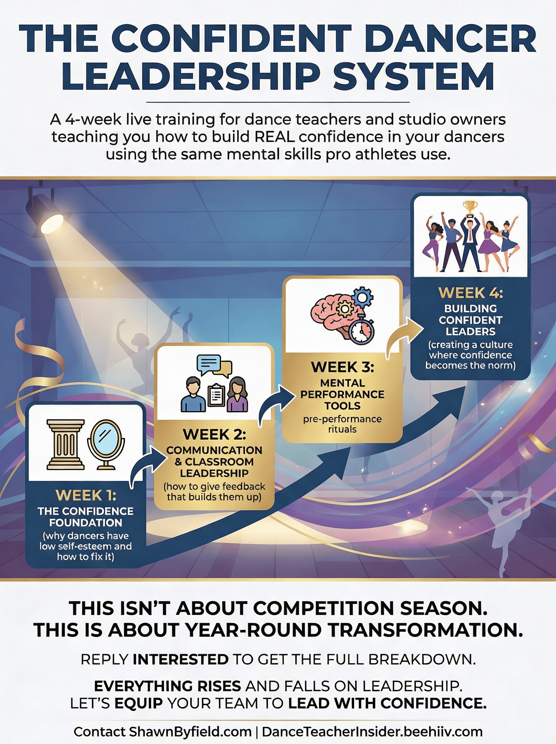 As a certified leadership coach, I’m opening 5 studio spots for The Confident Dancer Leadership System. It's a 4-week live training for dance teachers and studio owners that teaches you HOW to build REAL confidence in your dancers using the same mental skills pro athletes use.